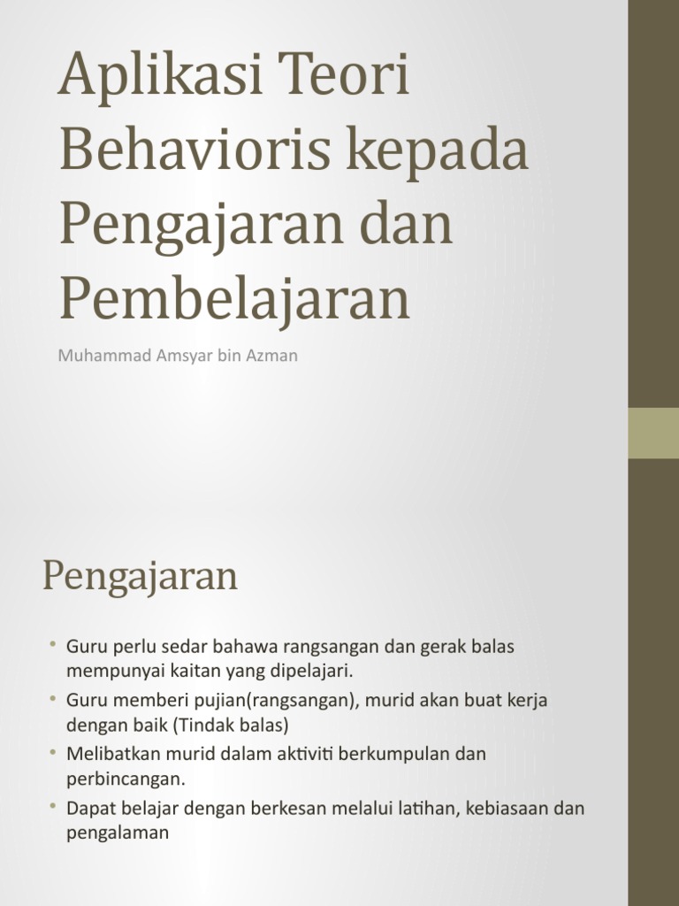 Tujuan pembelajaran, sifat materi pelajaran, karakteristik pebelajar, media dan fasilitas pembelajaran yang tersedia. Dan pandangan konstruktivisme belajar sebagai sebuah proses di mana pelajar aktif membangun atau membangun. Pembelajaran berlaku dengan wujudnya perkaitan antara sesuatu rangsangan dengan sesuatu gerak balas. Teori belajar behaviorisme hanya berfokus pada aspek objektif diamati pembelajaran. Dalam pembelajaran ilmu pengetahuan alam teori belajar behaviorisme yang berpedoman pada perubahan tingkah laku setelah melakukan pembelajaran dapat diterapkan sudjana n, 1990. Aplikasi teori behavioristik dalam kegiatan pembelajaran yaitu karena memandang pengetahuan adalah objektif, pasti, tetap dan tidak berubah pengetahuan disusun dengan rapi. Teori pembelajaran yang deskriptif menempatkan kondisi dan metode pembelajaran sebagai given, dan memberikan hasil pembelajaran sebagai variable yang dengan kata lain, behaviorisme tidak mengakui adanya kecerdasan, bakat, minat dan perasaan individu dalam suatu belajar. Teori ini juga mementingkan persekitaran murid untuk membantu proses pengajaran dan pembelajaran. Pada dasarnya teori behaviorisme bukanlah teori yang dikhususkan untuk pembelajaran bahasa inggris. Teori behaviorisme telah dipelopori oleh seorang ahli psikologi iaitu b. Pelaziman klasik dan pelaziman operan adalah contoh teori behaviorisme yang menekankan kajian tentang tingkah laku yang dapat diperhatikan. Teori belajar adalah suatu teori yang di dalamnya terdapat tata cara pengaplikasian kegiatan belajar mengajar antara guru dan siswa, perancangan metode pembelajaran yang akan. Tujuan pembelajaran menurut teori behavioristik ditekankan pada penambahan pengetahuan, sedangkan belajar sebagai aktivitas mimetic, yang menuntut 1.