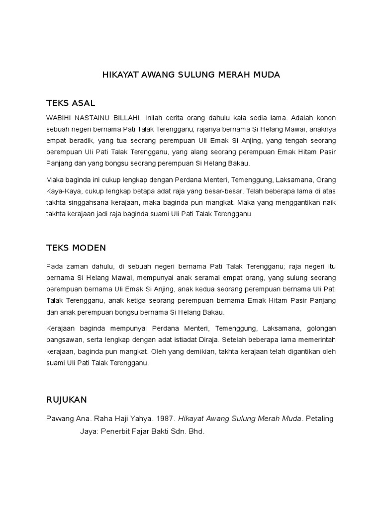 Itbm Hikayat Awang Sulung Merah Muda Bahasa Mandarin from www.itbm.com.my Hikayat awang sulong merah muda (jawi: Hikayat awang sulong merah muda merupakan salah satu daripada kesasteraan bahasa melayu yang ditulis pada masa dahulu sekitar 1907. It came from an oral tale narrated by pawang ana and was written by raja haji yahya. It came from an oral tale narrated by pawang ana and was written by raja haji yahya. May 18, 2017 · awang sulung merah muda melarikan diri dia kemudian menjadi pelayan putri dayang seri jawa , sementara putri datuk batin alam putri dayang nuramah yang jatuh cinta dengan awang sulung merah muda tidak ingin dia jatuh ke tangan wanita lain. Ia merupakan satu cerita lisan yang disampaikan oleh pawang ana dan ditulis oleh raja haji yahya dan diterbitkan oleh sir r. Setelah awang sulung merah muda dewasa, entah mengapa tuanku datuk batin alam berubah menjadi benci kepada awang sulung merah muda (saya tak faham bahagian ini) menyebabkannya merantau membawa diri. Pengasas seni silat awang sulung merah muda (pssasmm) ialah allahyarham tuan haji shafie bin zahid.
