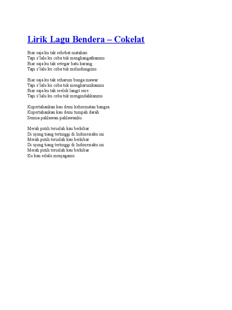 Chord Gitar Dan Lirik Lagu Bendera Cokelat Merah Putih Teruslah Kau Berkibar Tribun Manado from cdn-2.tstatic.net A e f#m e merah putih teruslah kau berkibar d c#m di ujung tiang tertinggi bm e di indonesiaku ini a e f#m e merah putih teruslah kau berkibar d c#m di ujung tiang tertinggi bm e di indonesiaku ini f#m e a merah putih teruslah kau berkibar. Merah putih teruslah kau berkibar. Saya teringat saat masih anak ingusan di tiap bulan agustus. Lagu bendera banyak diputar ketika menjelang hari. Merah putih teruslah kau berkibar d e a ku akan selalu menjagamu. Agustus, bulan yang spesial bagi seluruh rakyat dan bangsa ini. Kupertahankan kau demi tumpah darah. Lirik lagu bendera diciptakan oleh eross candra yang dirilis pada tahun 2002.